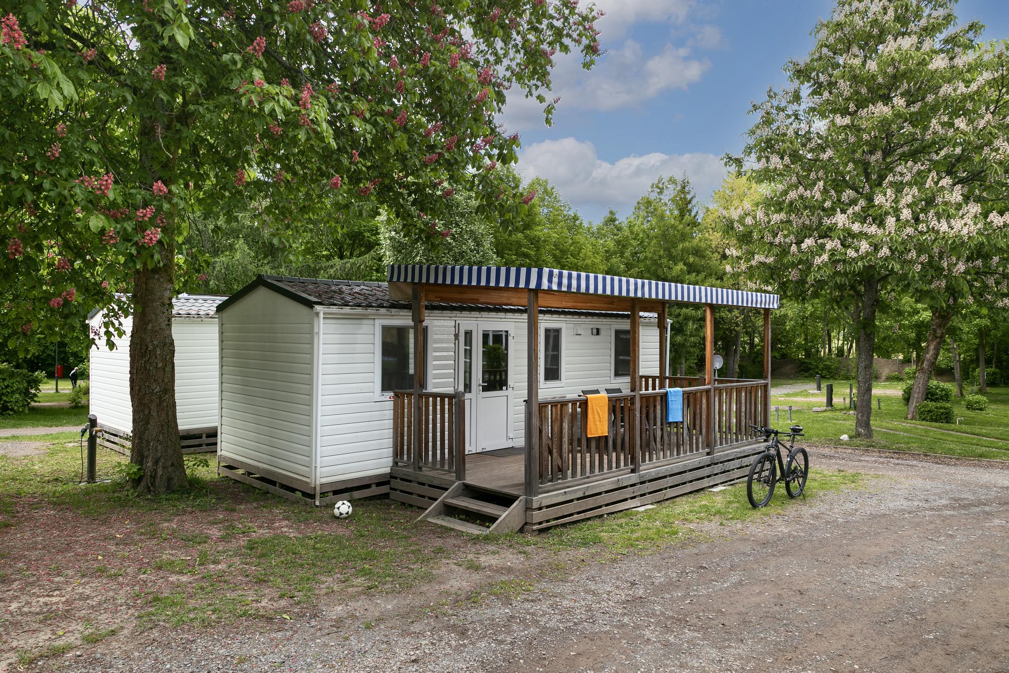Das großzügige Mobilheim Orion ist komplett eingerichtet und mit einer großzügigen teilüberdachten Holzveranda ausgestattet. Es eignet sich für maximal 6 Personen. Im Wohnbereich befindet sich eine Sitzgruppe. Die Küche ist mit einem Gasherd, Kühlschrank, Kaffeemaschine, elektrischem Wasserkocher, Mikrowelle und komplettem mit Koch- und Essgeschirr ausgestattet. Im Elternschlafzimmer befindet sich noch ein Kleiderschrank. Das zweite und dritte Schlafzimmer verfügt über 2 Einzelbetten sowie einen Kleiderschrank. Decken und Kissen befinden sich für 6 Personen im Mobilheim. Das Badezimmer mit Dusche, WC und Waschbecken verfügt über Ablagemöglichkeiten und einen Spiegel. Ein zusätzliches WC gibt es separat vom Bad. Ein Set Gartenmöbel wartet zum Verweilen auf der Terrasse.